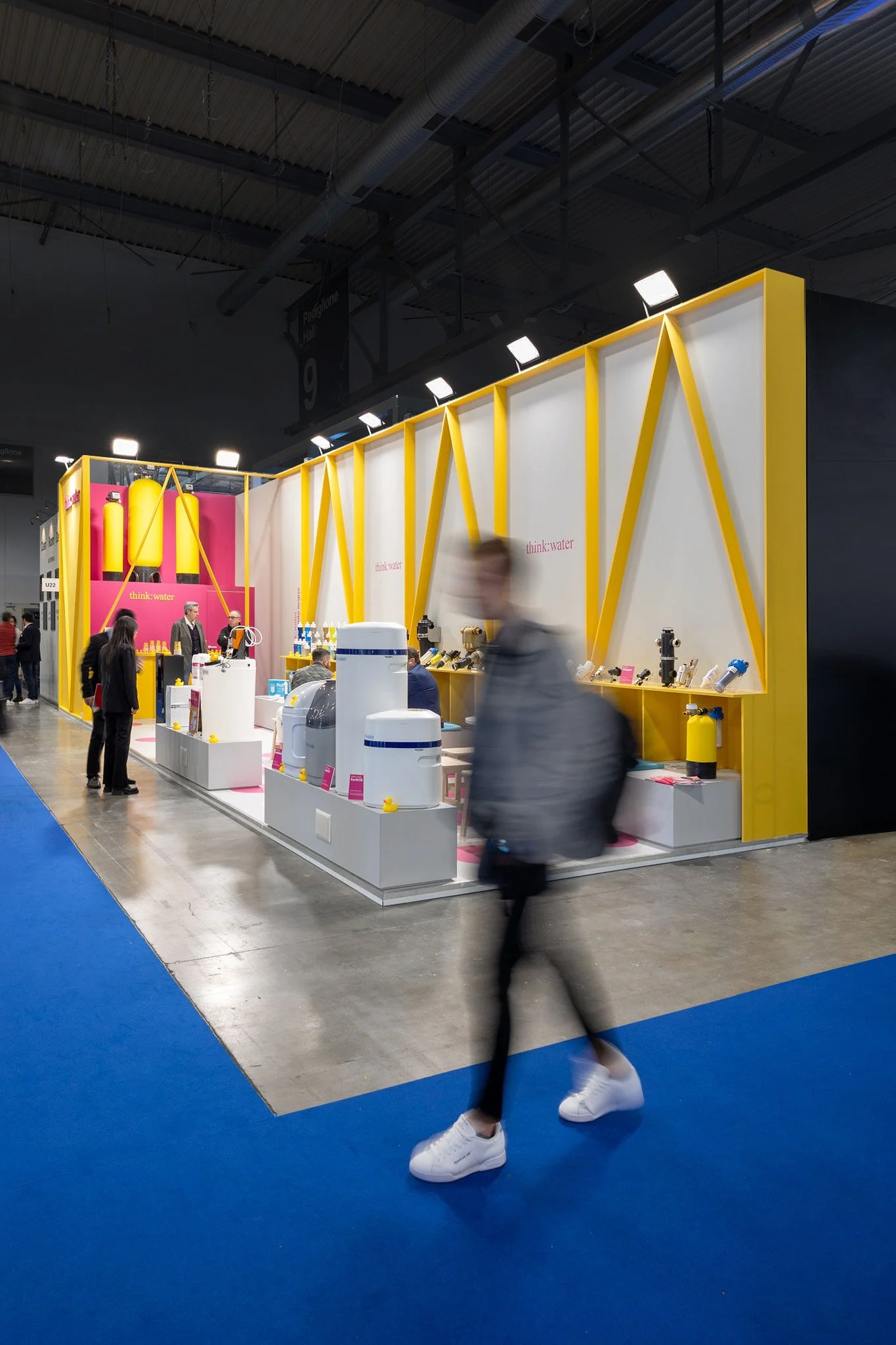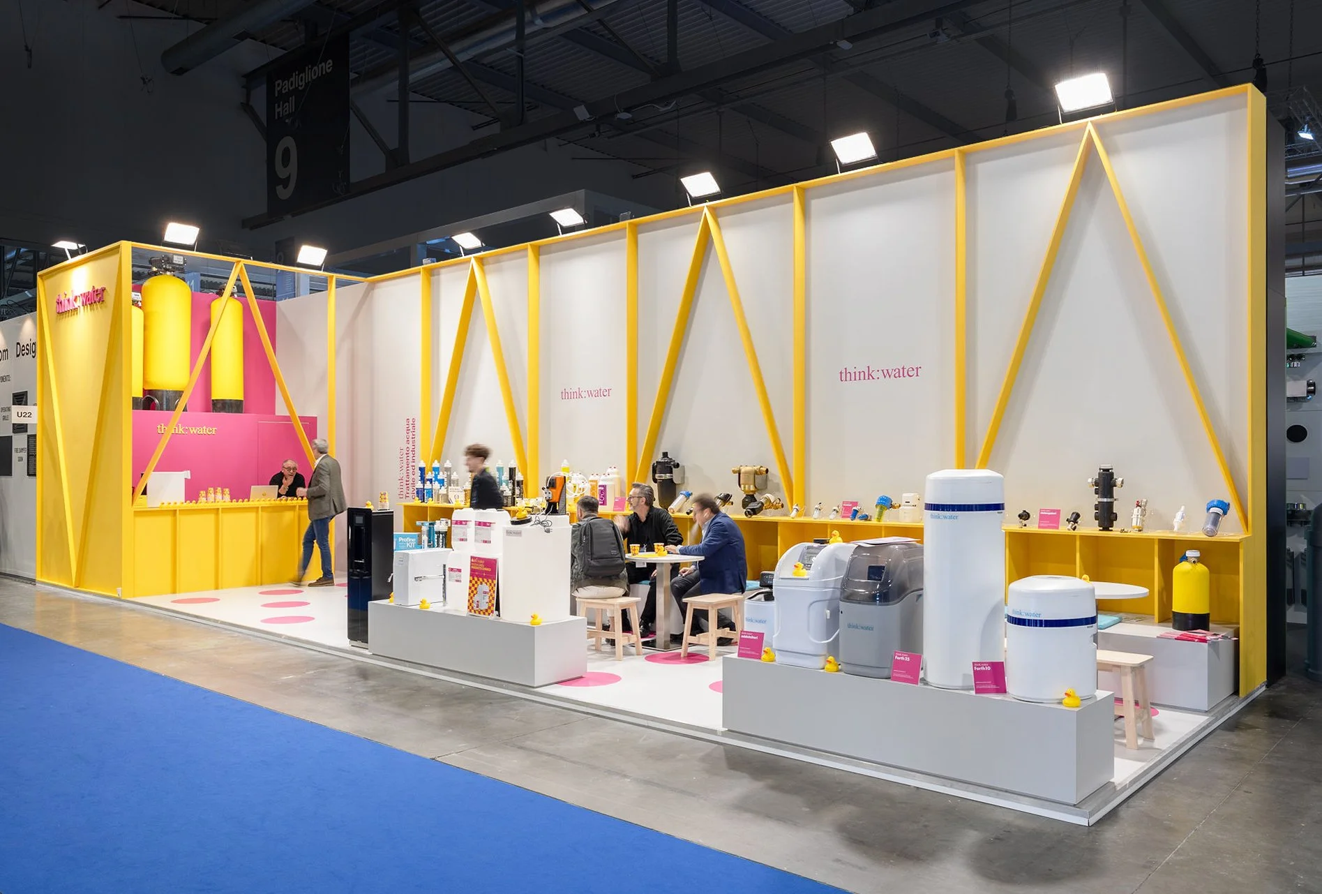A meeting place in symbiosis with the company’s vibrant world. Structural elements become graphic signs that articulate the space and delineate the exhibition areas, with the floor animated by a macro polka-dot pattern.