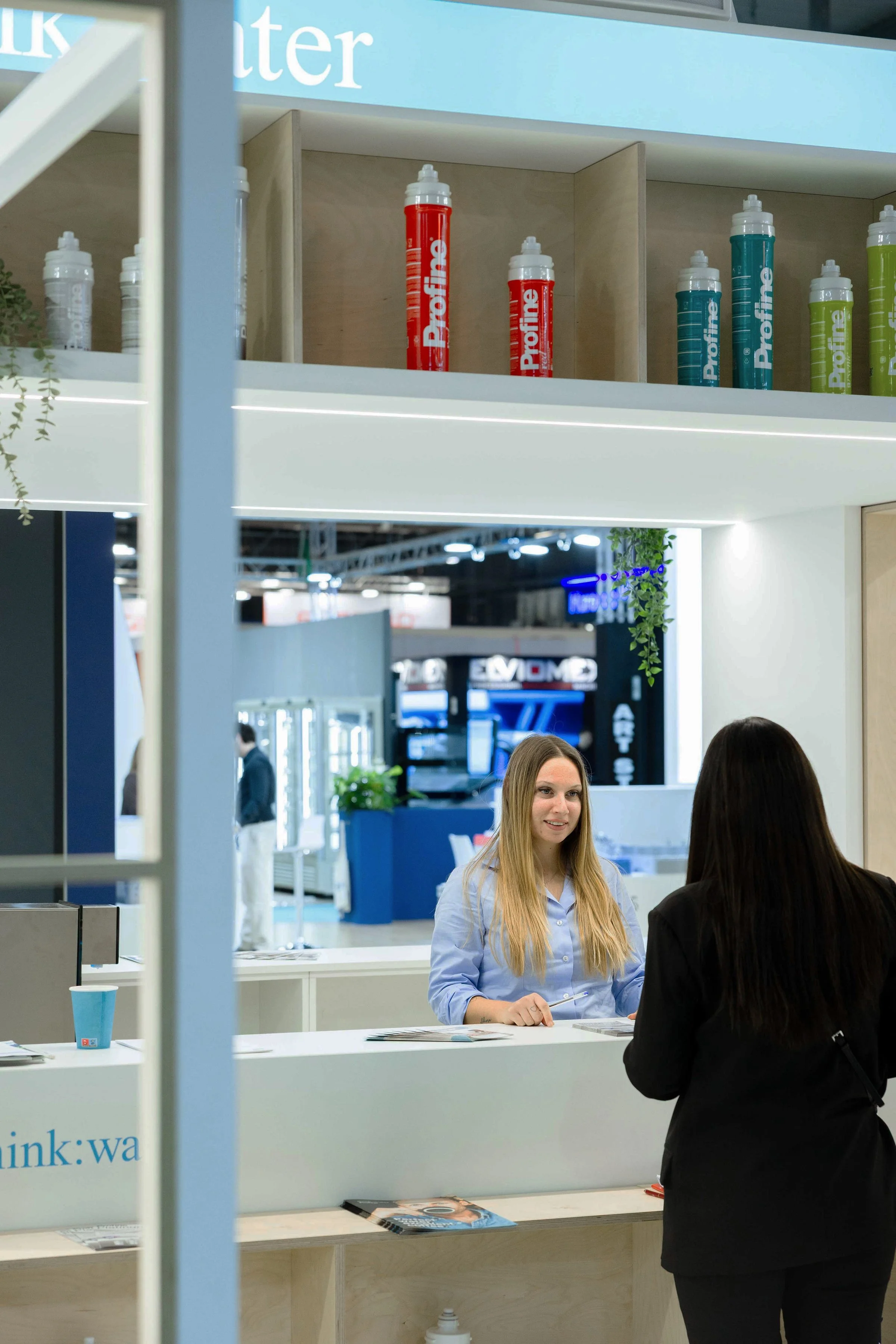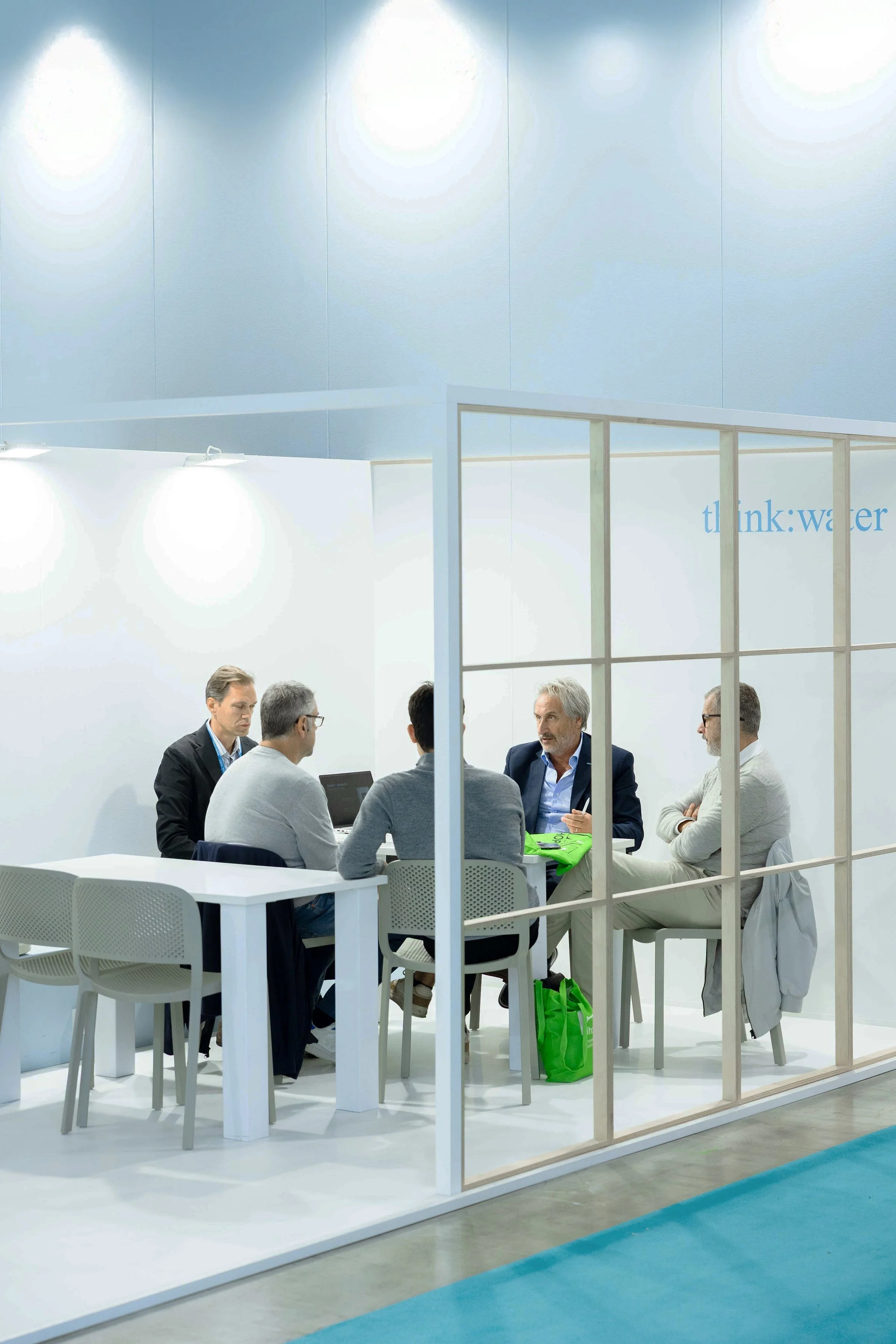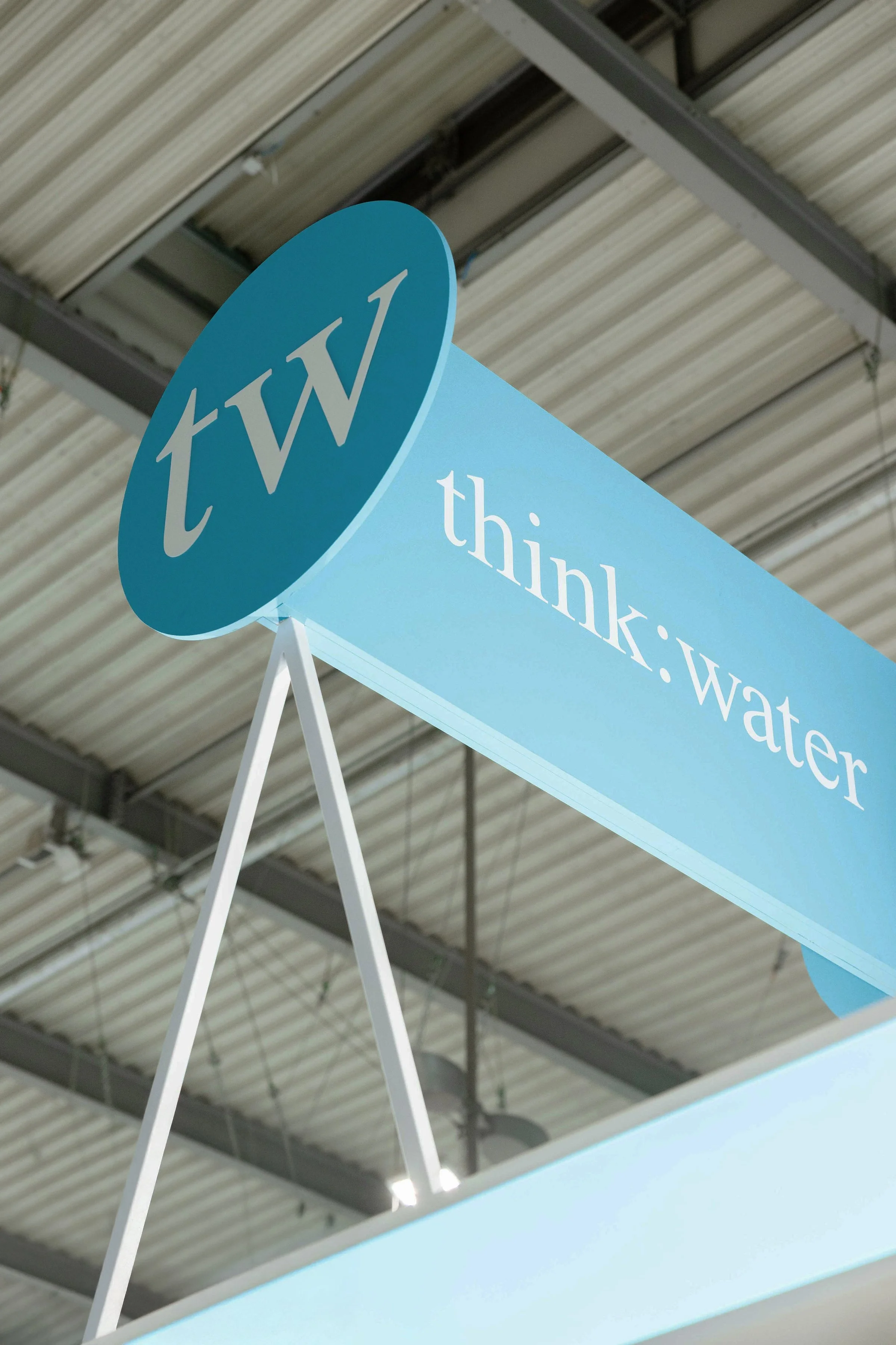 Think:Water's 2025 modular display system for exhibition displays is an abacus of volumes and niches that are combined by following the square mesh and overlapping shades of blue, white, and birch essence.