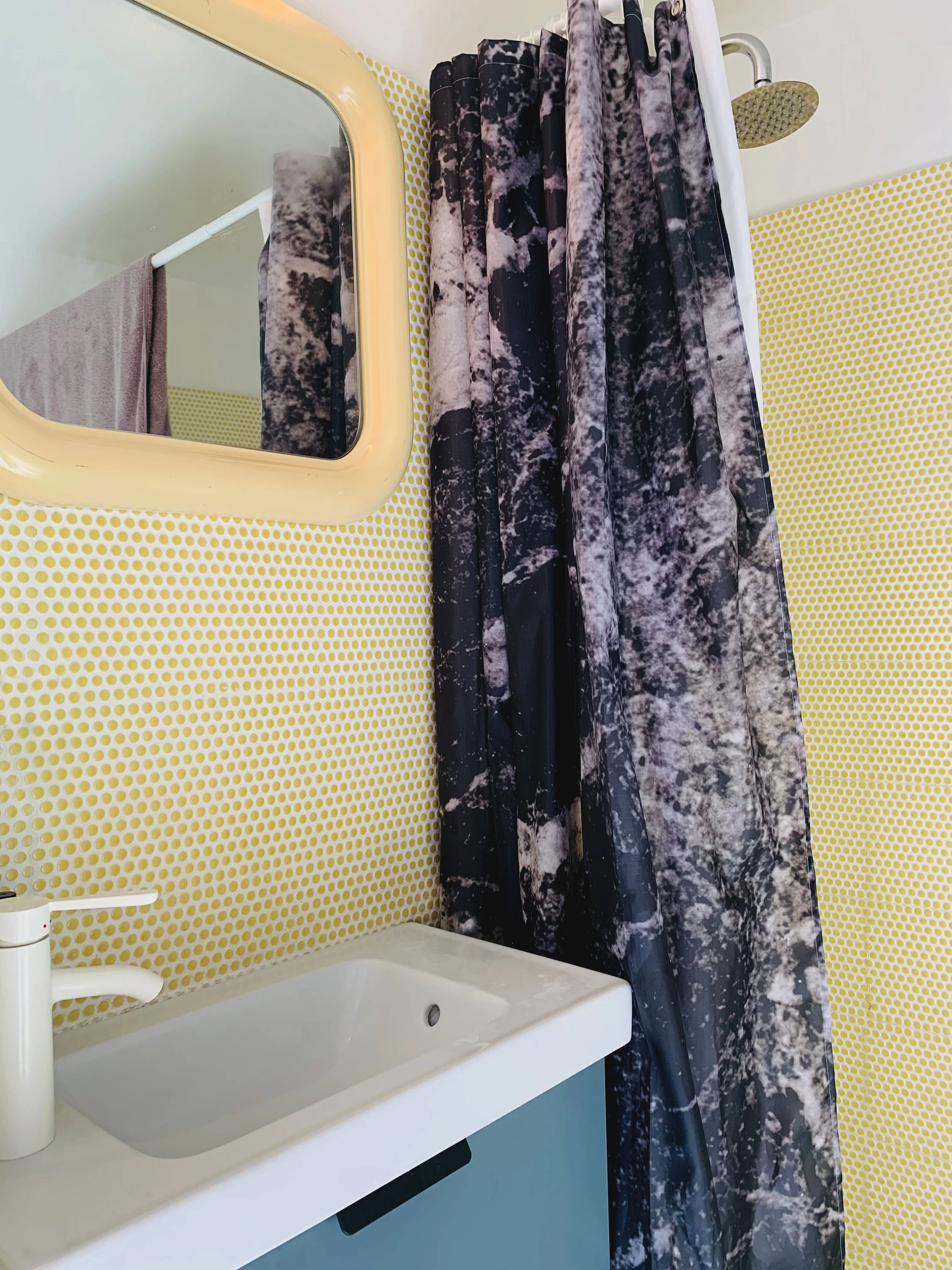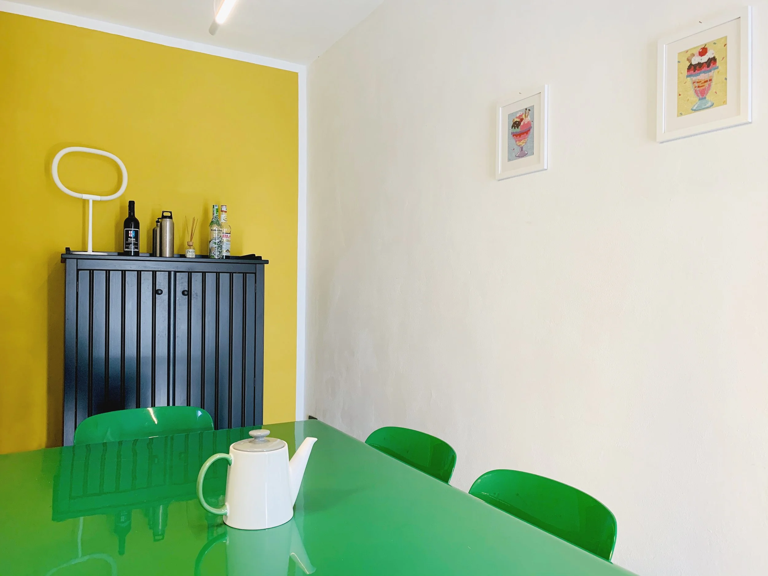 The interior design project creates new openings in an apartment with a garden in Liguria. The bedroom (originally a cellar) is connected to the living area by a light perforated metal staircase, whose first steps form the headboard of the bed. Fields of color establish graphic connections throughout each room.