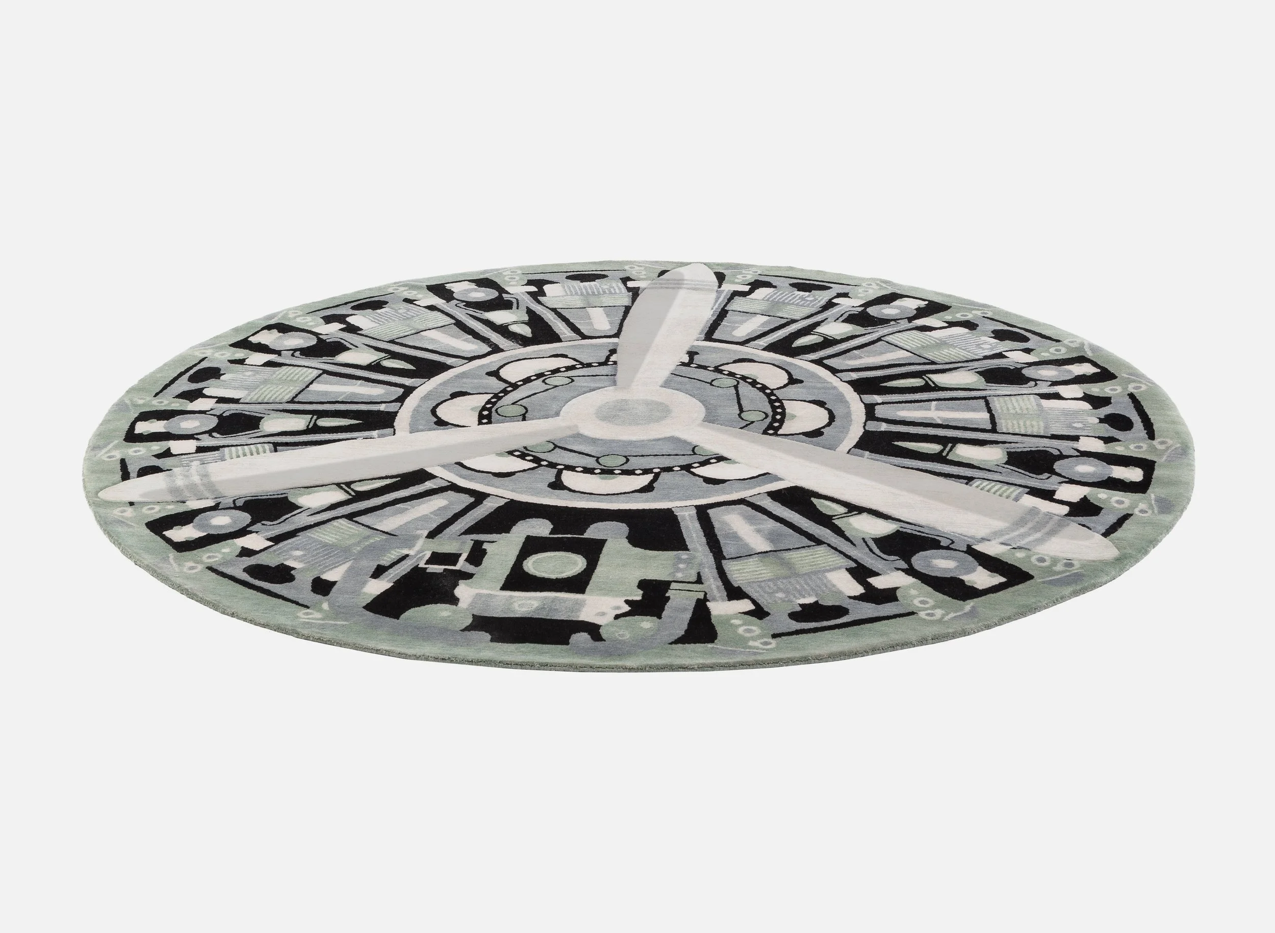 This round carpet is a tribute to mechanics. The pattern of this wool artifact depicts an airplane rotor, with prominent blades that create the motion enabling the aircraft to lift into the air. It is a carpet that demands remarkable technical skill from the weavers, as a high number of knots is required to faithfully reproduce the intricate details of the pattern.
