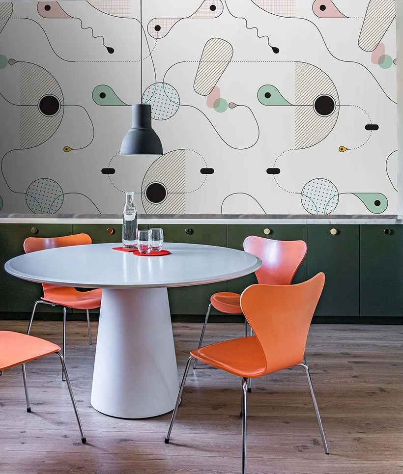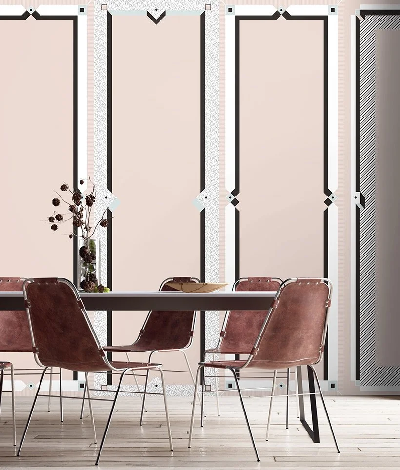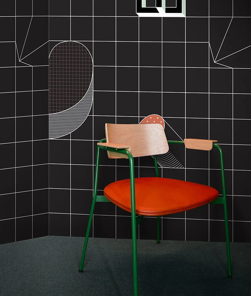 Ovum: The curvy line, the circle and the oval as basic elements of where life it self begins, creates an abstract version of the fertilization of the egg. Boiserie: The timeless charm of the classic embossed wall decoration, reinterpreted in a two-dimensional key through the use of geometry and colours. Grid: Sometimes doodles made while daydreaming become repetitive designs: a grid of little squares can turn into a web from which three-dimensional animated objects come out.