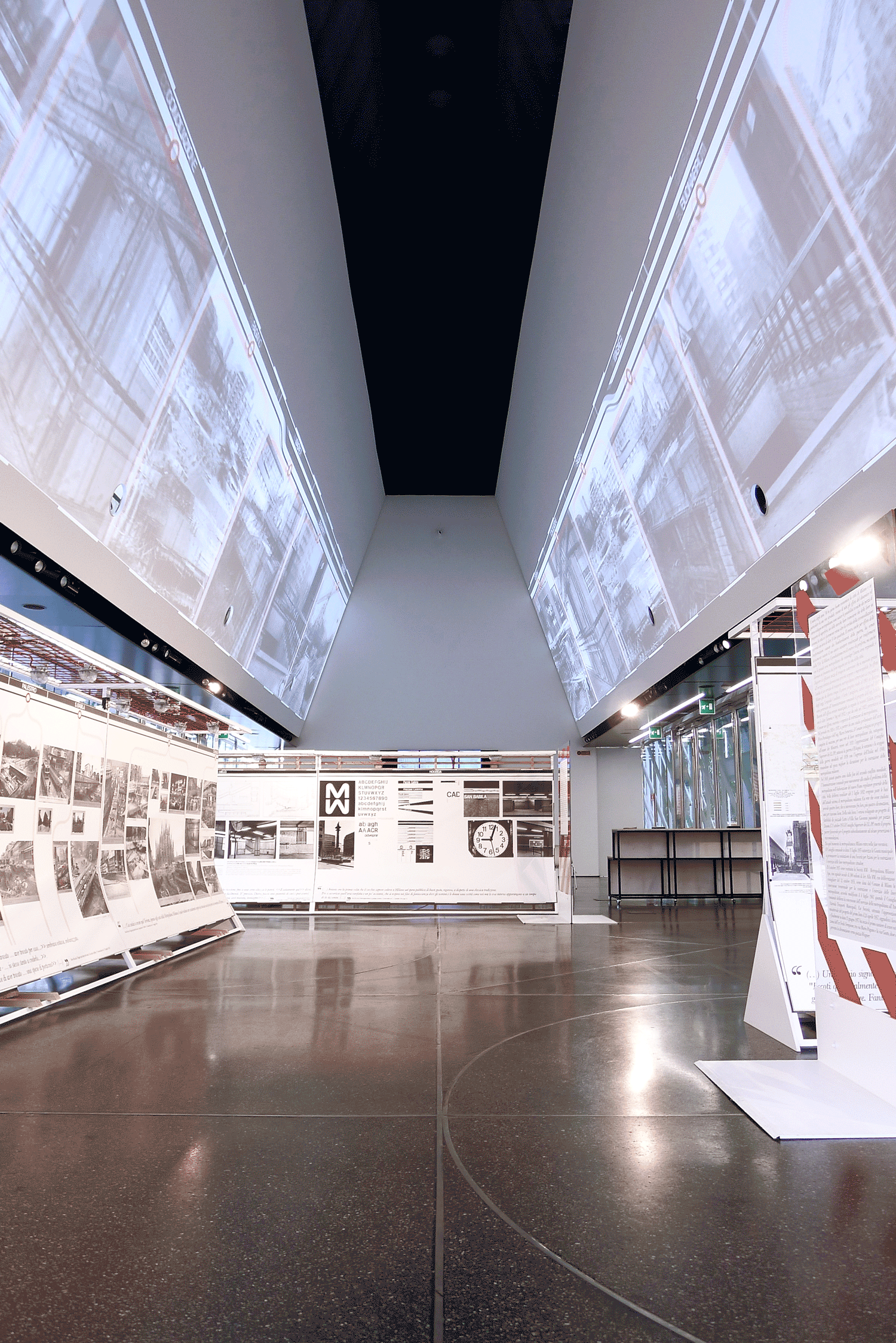 A traveling exhibition celebrating the 50th anniversary of the construction of Milan’s Metro Line 1. Free-standing panels illustrate the key stages of the project that tore through the city, while the exhibition design evokes the world of construction sites.