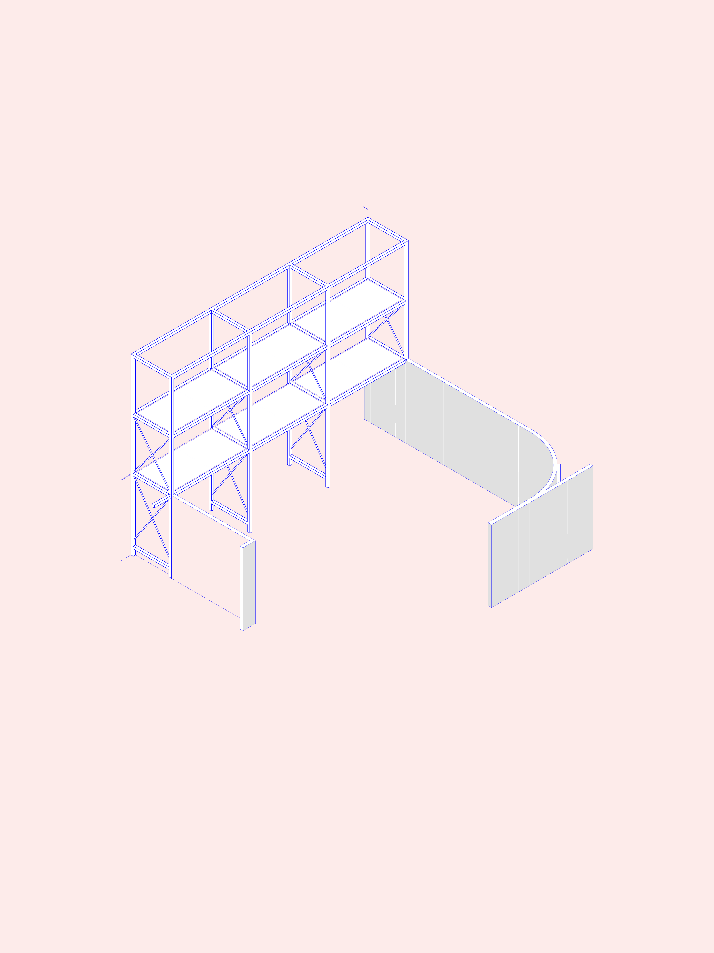 The project is structured through a system of orthogonal axes that shape the two architectures of opening and closing the space, and through a grid layout in which the "exhibition islands" are arranged.